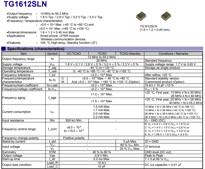 温度补偿晶体振荡器TG1612SLN使用爱普生开发和制造的IC和MHz基本型晶体,可在105℃温度环境下工作并具有待机功能。结合小尺寸,高度低、压力和模制密封阻力的单密封结构的优势,TG1612SLN物联网和工业应用的很好选择。TG1612SLN频率范围:13MHz至55.2MHz,输出方式:削顶正弦波,供电电压:1.7 V至3.63 V(1.8 V ±0.1 V / 2.8 V ±5 % / 3.0 V ±5 % / 3.3 V ±5%)工作温度:-40℃至+105℃。并且TG1612SLN可以兼容ST,支持高标准要求的产品设计,下面彩神vll电子就给大家分享下TG1612SLN规格书,以供大家选型参考: